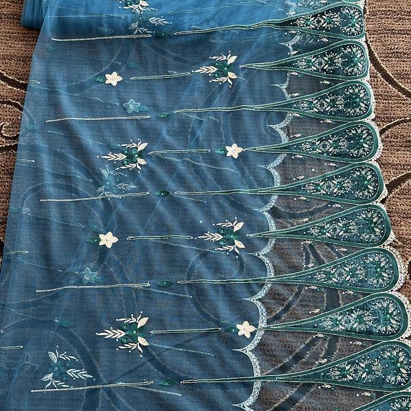 Teal tulle with emerald green velvet border patches and white embroidered