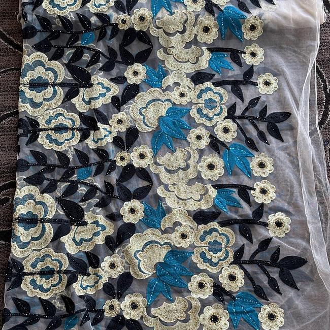 Gold, torquoise and black embroidery on tulle ground with stones