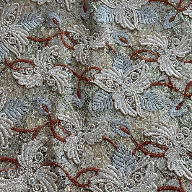 Iridescent chantelle with white and powder blue guipure with copper embroidery